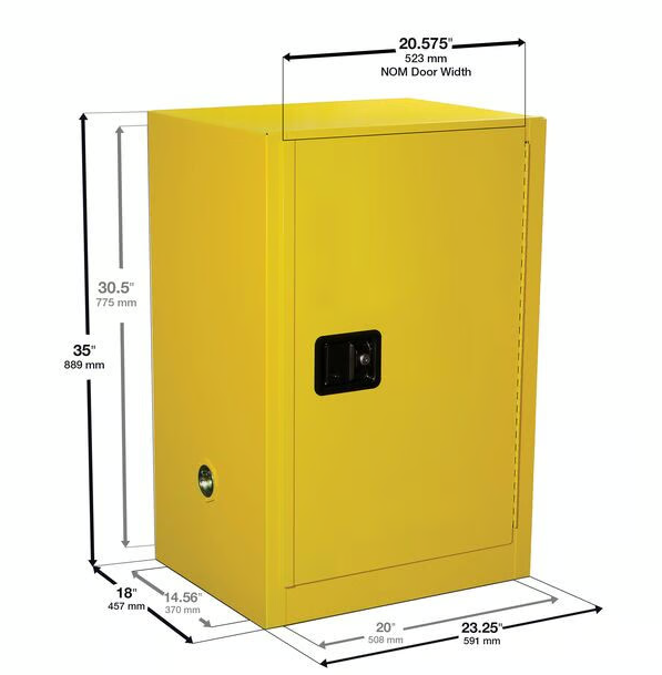 • Justrite Sure-Grip® EX Kompakt Güvenlik Dolabı, Manuel Kapatma Kapılı (model 891200), solventlerin ve aerosoller, temizleyiciler ve yağ gidericiler gibi yanıcı sıvıların tezgahlarında ve çalışma tezgahlarında güvenli ve faaliyetlera uygun şekilde çalışmaya yöneliktir. Güvenlikten sağlanan kesintilerin erişilebilirliği artırmak için tasarlanan bu sarı kabin, sınırlı zemin alanına sahip bakım garajları için idealdir.