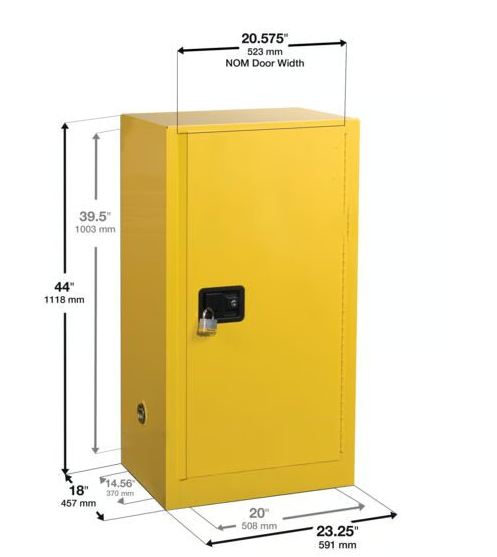 • Kendiliğinden Kapanan Kapıya sahip Justrite Sure-Grip® EX Kompakt Güvenlik Dolabı (model 891520), solventlerin ve aerosoller, temizleyiciler ve yağ gidericiler gibi yanıcı sıvıların tezgahlarda ve çalışma tezgahlarında güvenli ve ürünlere uygun şekilde üremeye yöneliktir. Güvenlikten sağlanan kesintilerin erişilebilirliği artırmak için tasarlanan bu sarı kabin, sınırlı zemin alanına sahip bakım garajları için idealdir.